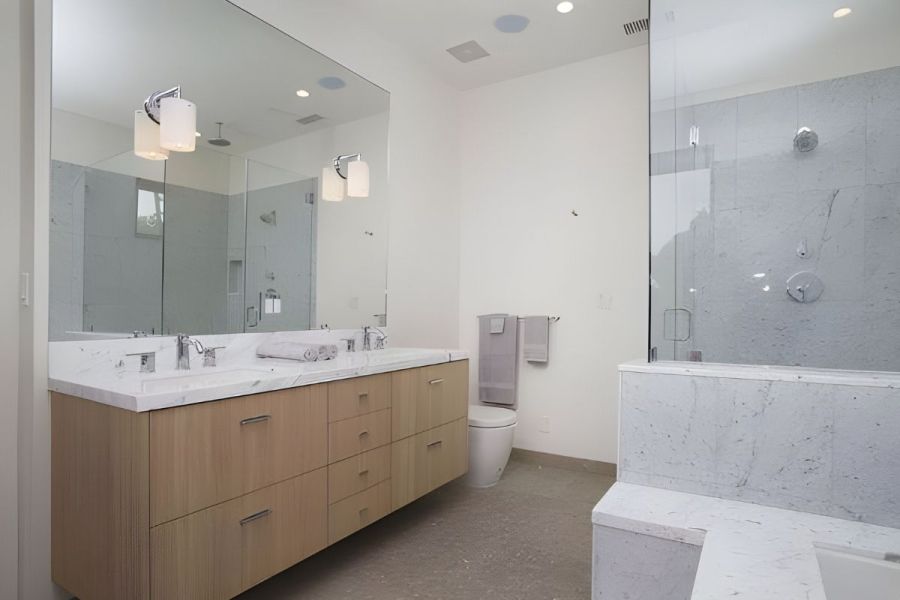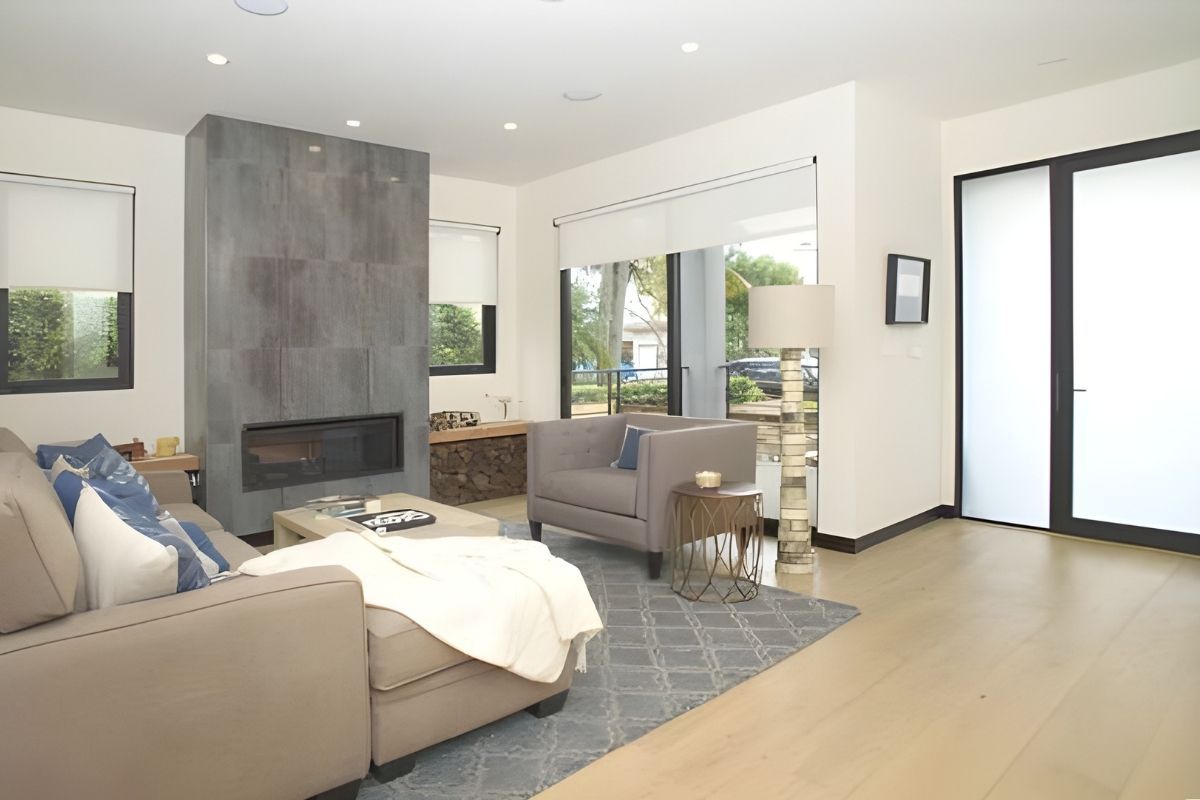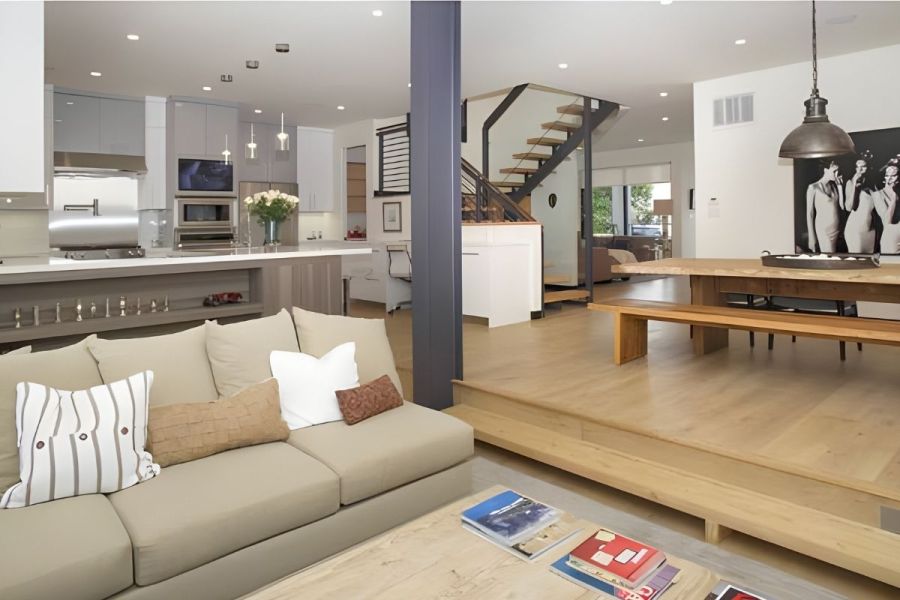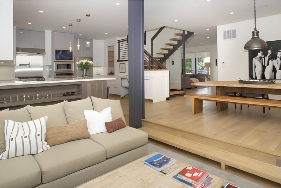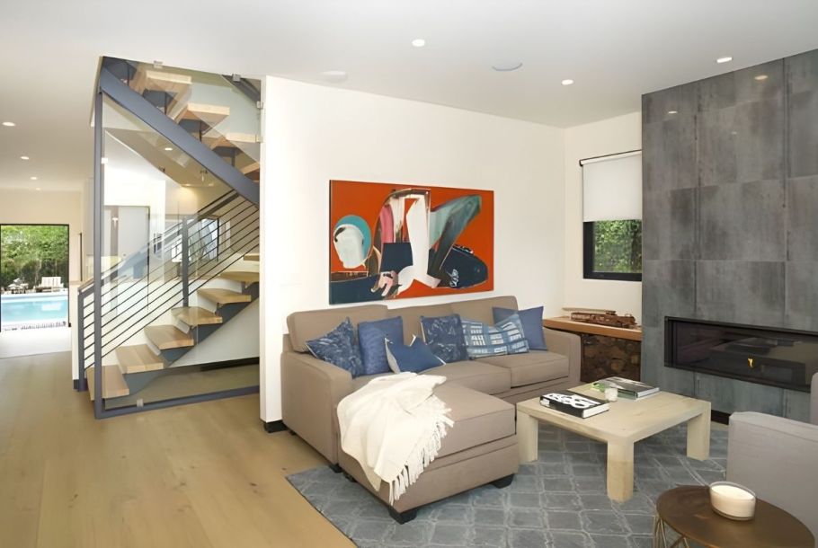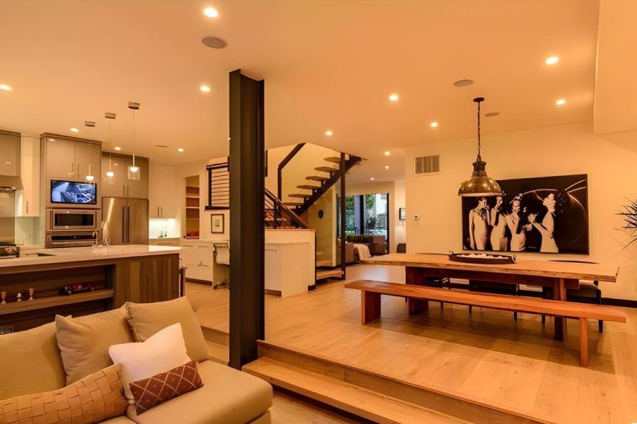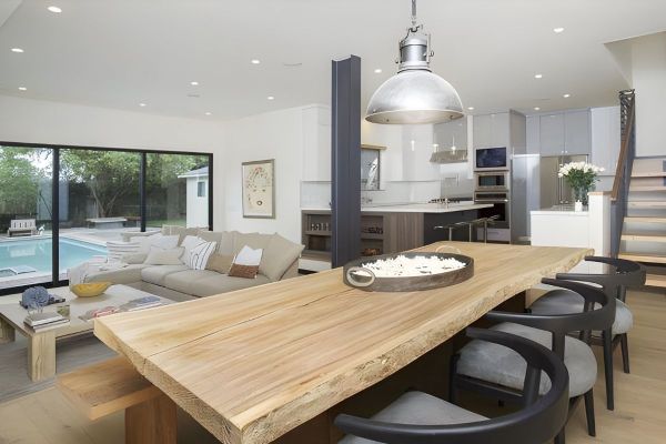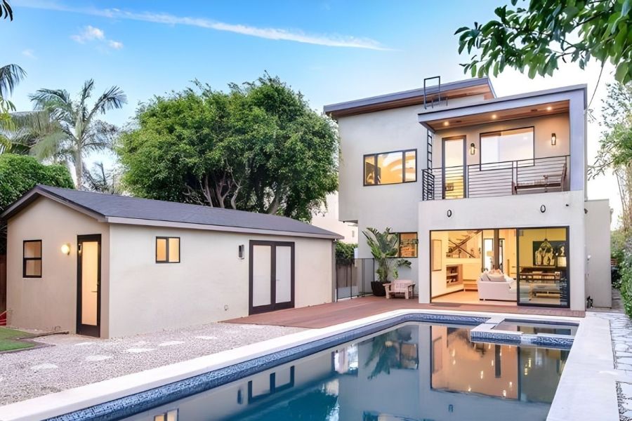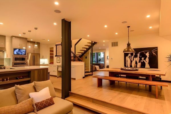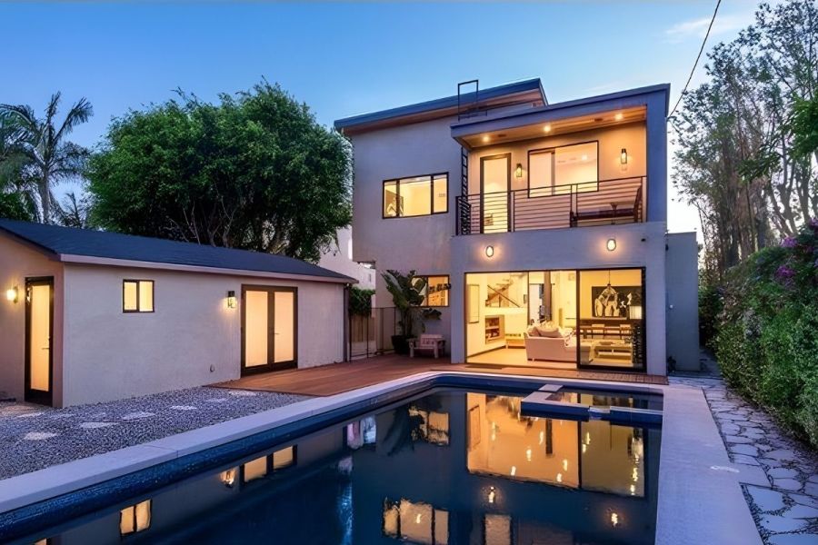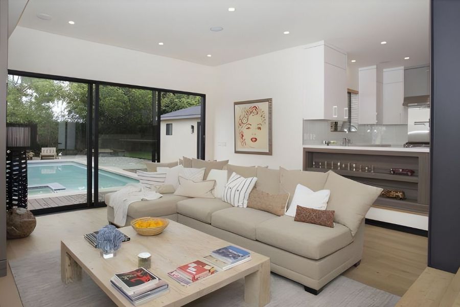 - The home's versatile floorplan and striking clean lines make it designed for the California work/home lifestyle by the beach. Entertaining is invited in the light-filled and expansive rear-facing family room and dining room, lined by walls of glass, making way to your expansive private oasis, featuring a beautiful pool and spa, dining area, firepit, outdoor movie space, and pool bath.