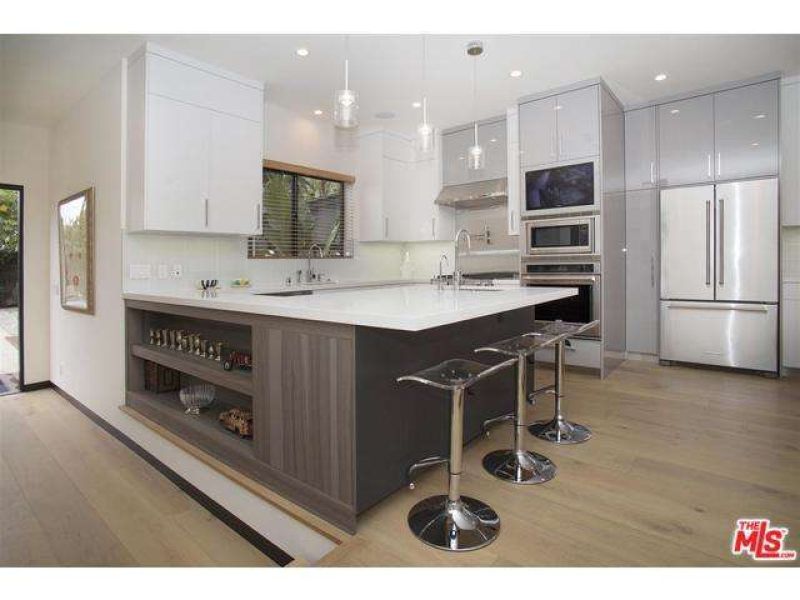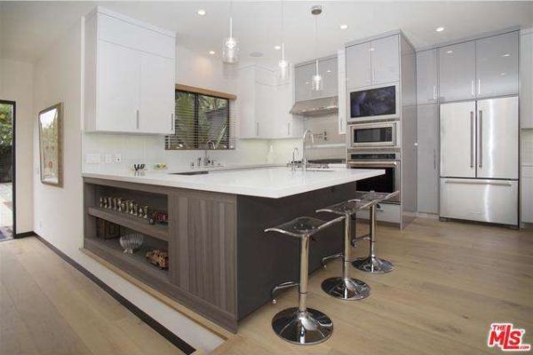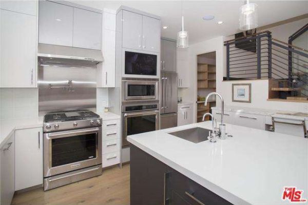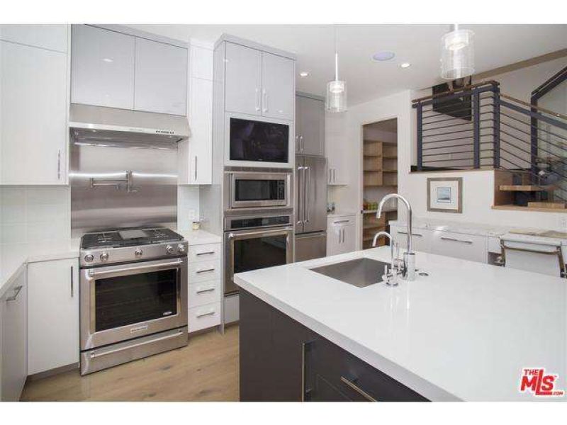 -             Inside, the gourmet chefs kitchen features an enormous walk-in pantry, stainless steel appliances, large Caesarstone island, and additional marble topped workspace with storage.